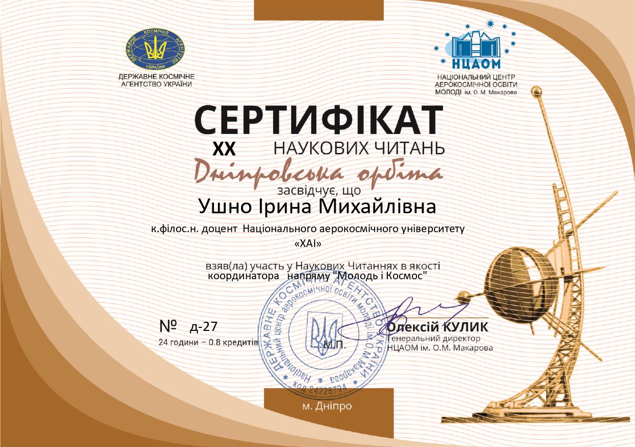 Другій рік поспіль доцент кафедри Ушно Ірина Михайлівна виступає координатором секції "Філософія і Космос" та Молодь і Космос" на ІХХ та ХХ Наукових читаннях "ДНІПРОВСЬКА ОРБІТА", м. Дніпро.