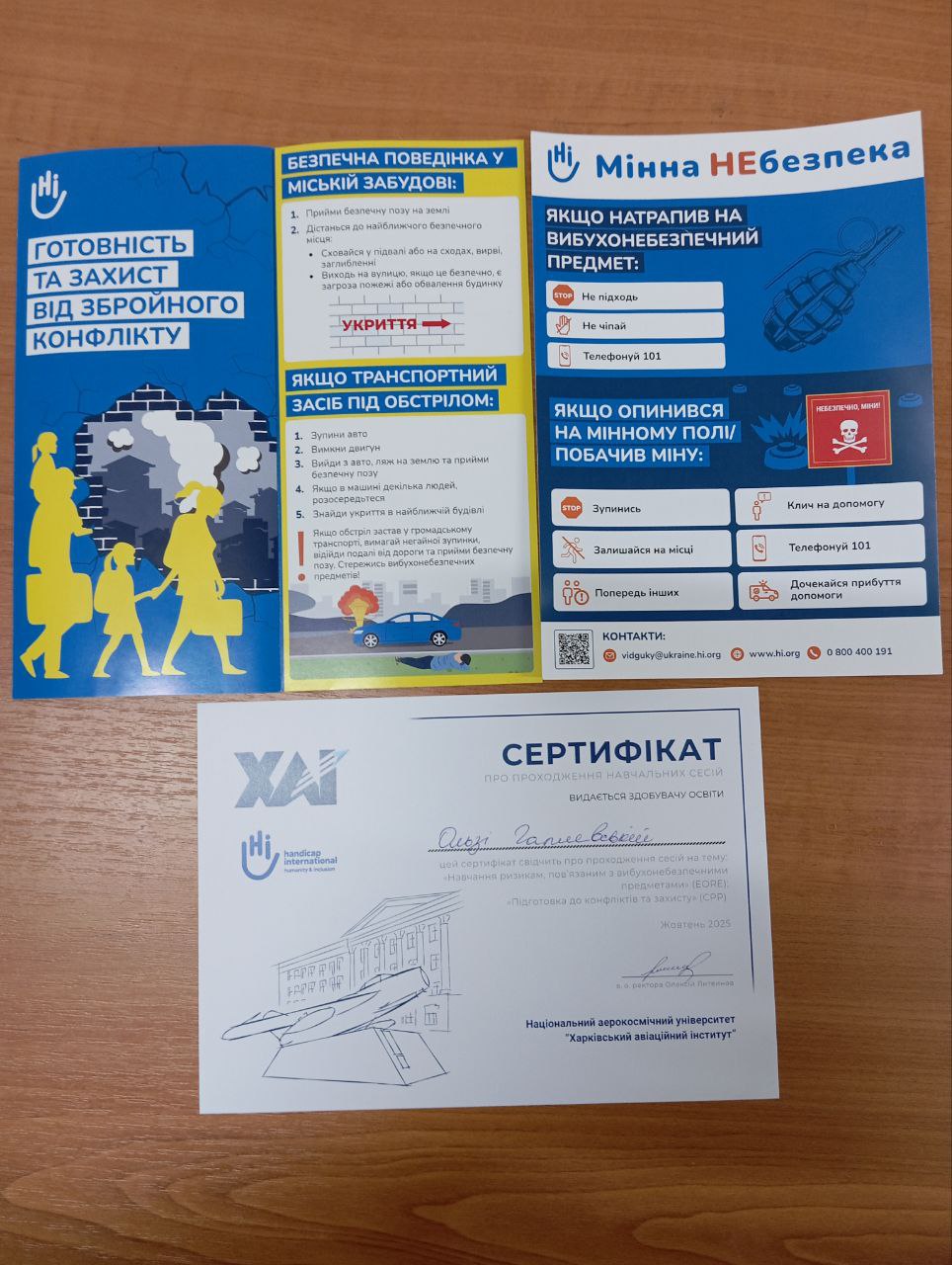 29 жовтня 2025 року в укритті Національного академічного університету "Харківський авіаційний інститут" відбулася сесія з цивільної безпеки на тему: "Навчання ризикам, пов'язаним з вибухонебезпечними предметами";"Підготовка до конфліктів та захисту". Після проходження навчальної сесії, зав. лаб. Гаплевська О.І. отримала сертифікат.